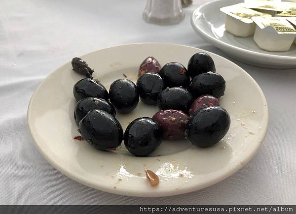 餐廳招待的零嘴: 醃橄欖。很酸, 阿甘一向不愛。