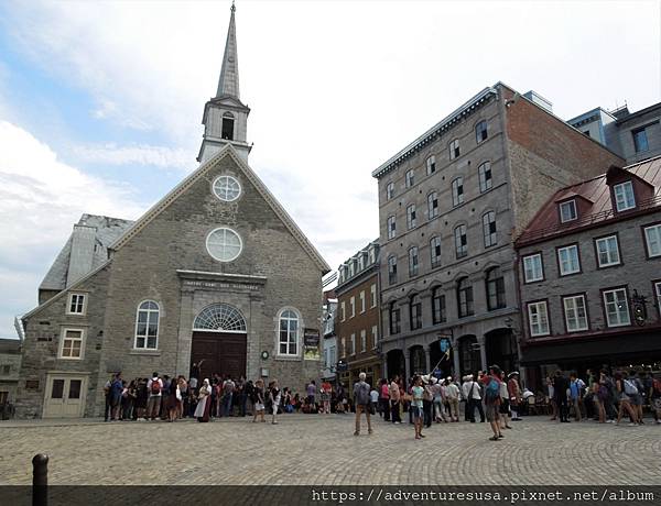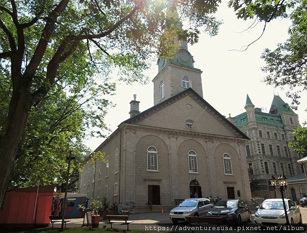 街道隔壁是古老的 Holy Trinity 大教堂。教堂右邊乃方提納城堡飯店: 阿甘介紹過的魁北克打卡景點第一名。