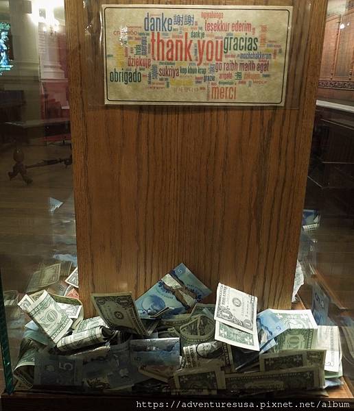 捐獻箱上方有不同語言的感謝語,箱子裡至少一半是美金呢! (阿甘沒捐~)