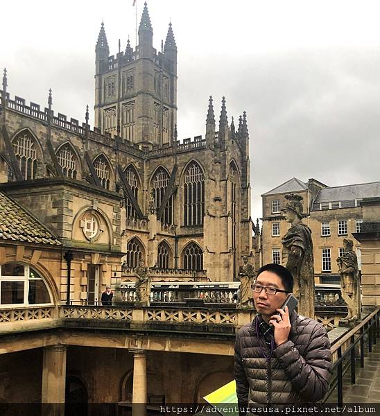 阿甘不是在講電話啦, 是在聽講解。後方高聳建築是巴斯修道院, 阿甘已經介紹過。