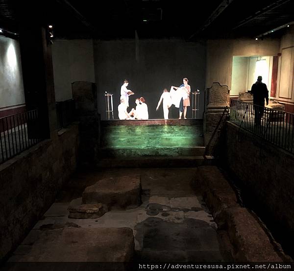 牆壁上的投影影片重現羅馬時代人民在浴場沐浴社交的情景。
