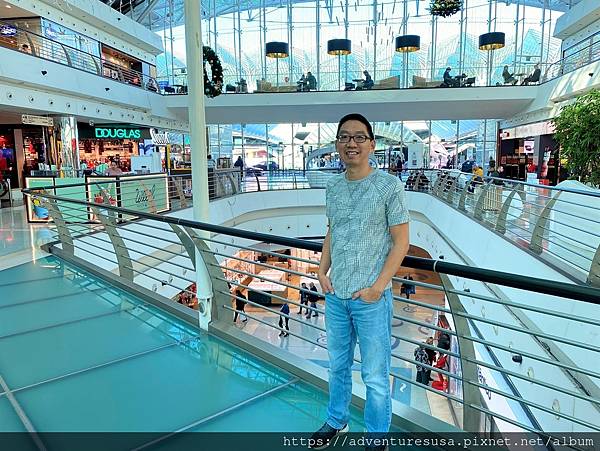 購物中心一進門就是長型挑高空間, 頭頂玻璃帷幕, 充足光線照耀在每個角落。