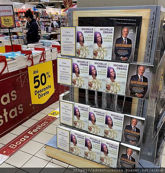 甚至販賣圖書! 架上擺著前美國第一夫人的著作。另一位前第一夫人梅蘭妮亞學識跟蜜雪兒相比十萬八千里。現任第一夫人則是教育博士。民主黨的第一夫人輕鬆取勝!