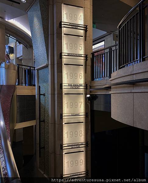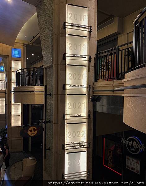 通往杜比戲院門口的樓梯兩邊列出每一年奧斯卡金像獎最佳影片得主, 可以看到最近一部得獎片是媽的多重宇宙。2019 年是韓片寄生上流。