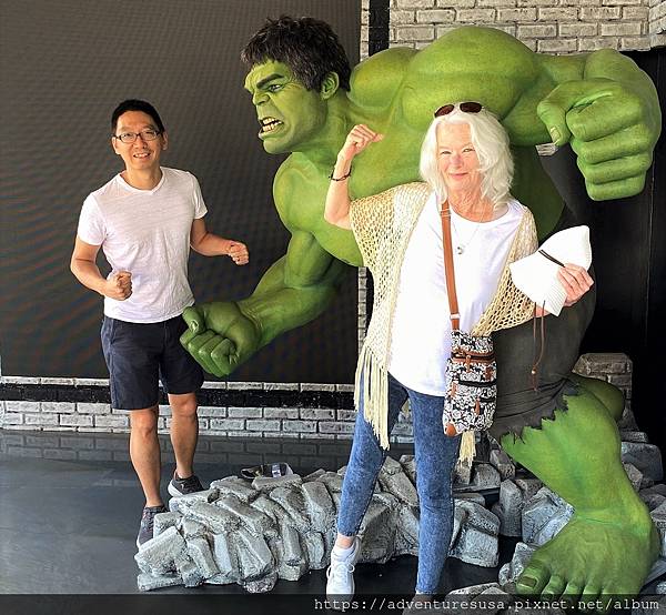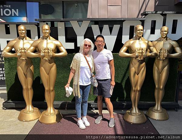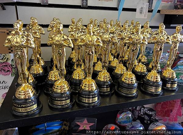 為什麼過了十二年又來好萊塢星光大道? 因為老同事到加州玩, 一定要帶她去洛杉磯最知名景點啊! 這一排小金人後面是一家紀念品商店, 小金人是他們的宣傳噱頭, 希望你拍完照能進去買東西。