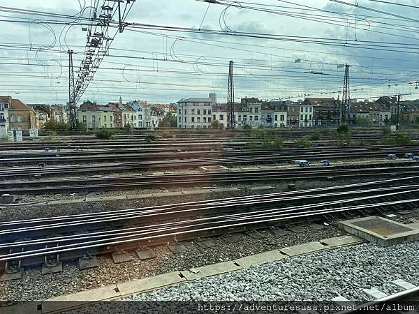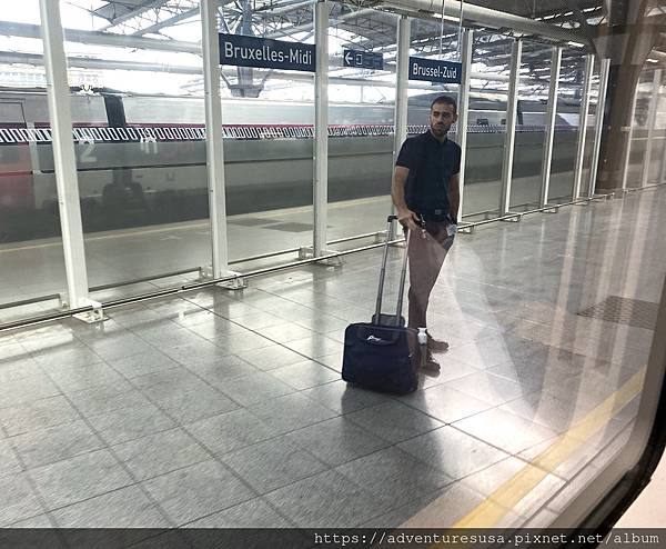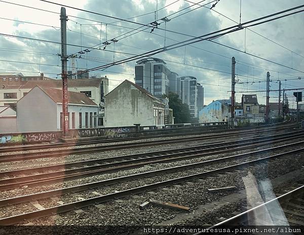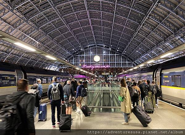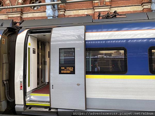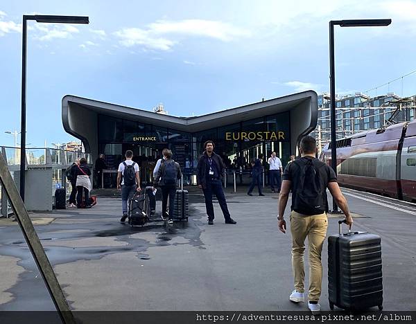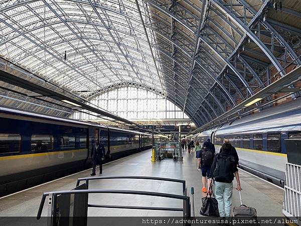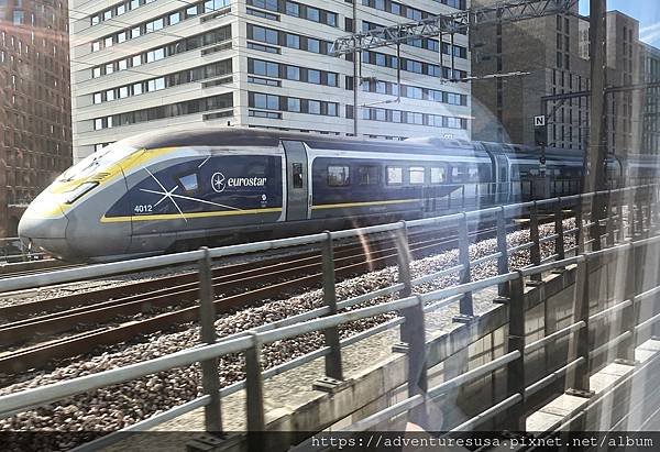 出站時看到另一列歐洲之星在軌道上。歐洲之星 Eurostar 從 1994 年開始倫敦和巴黎之間的客運服務, 倫敦到阿姆斯特丹路線則在 2018 年才開始營運。
