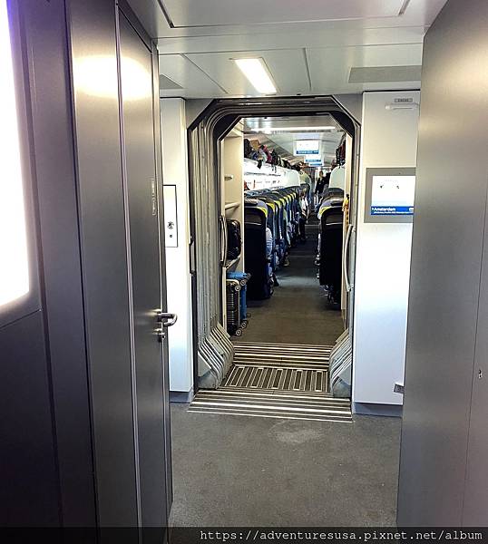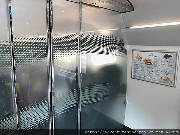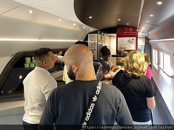 販賣區占車廂的一半, 車廂另一半是乘客座位區, 由這道門隔開。十一年前搭的 Eurostar 餐車大多了, 車廂內有數個高腳桌, 可以在餐車享用餐點。