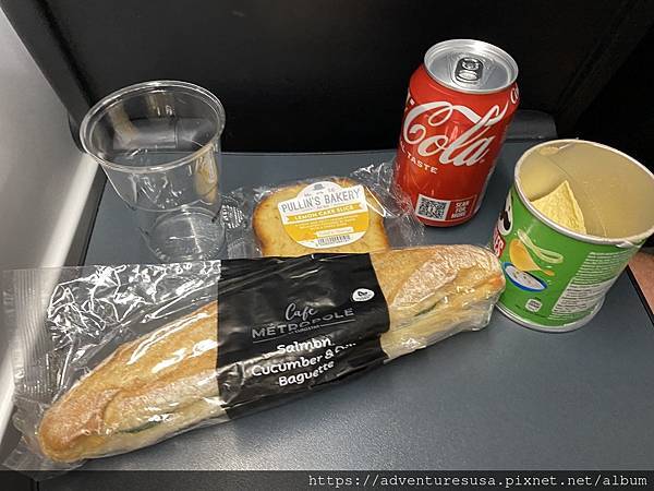 買完只能回自己座位吃。套餐: 品客洋芋片, 汽水, 法國麵包三明治 (鮭魚口味), 蛋糕。