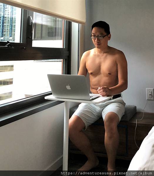 想打電腦的話, 好好利用角落的迷你辦公桌。但是人得坐在櫥櫃上, 感覺些許克難。