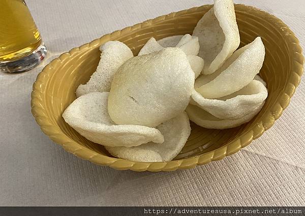一坐下來就有驚喜, 端來一籃開胃蝦片。美國的中國餐廳不會給蝦片。