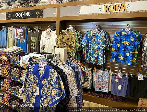 購物村還是以商店為主。這麼俗艷的襯衫是想賣給誰? 應該是有人買才會掛出來, 觀光客的品味很好預測的。