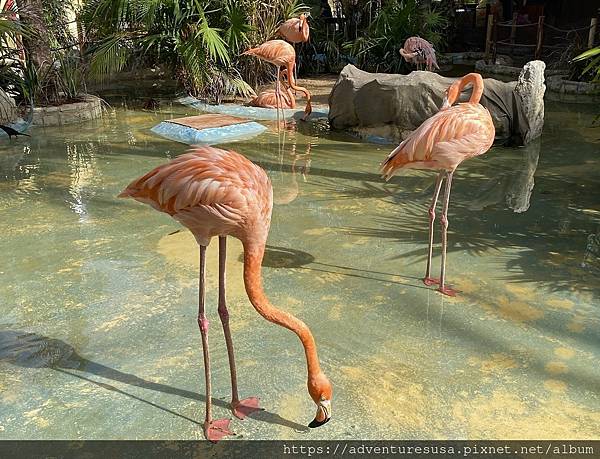 經過一個水池, 裡面有好幾隻紅鶴。