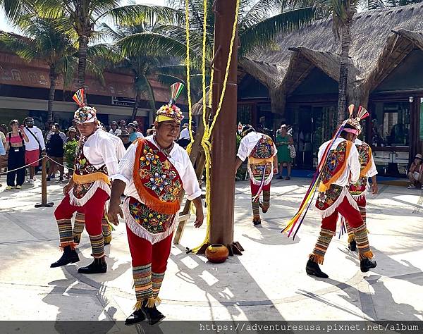 廣場上幾個當地人穿著傳統服裝表演舞蹈。