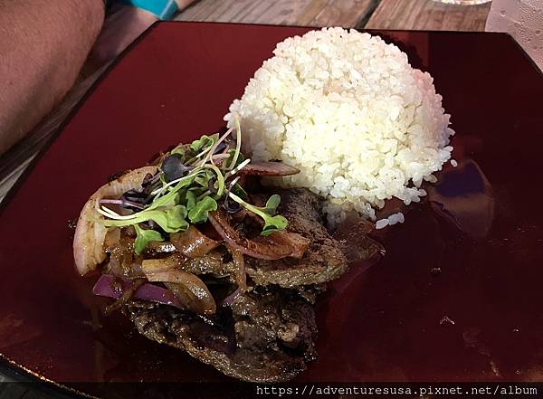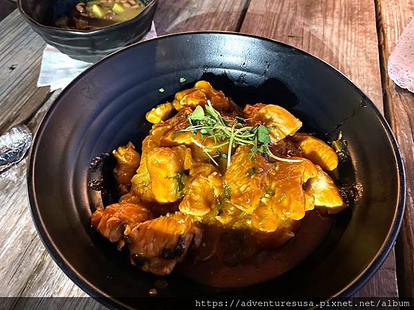 點了一份 mofongo。第三次來波多黎各, 第三次吃 mofongo, 經典當地美食。基本上是炸大蕉搗成泥狀混入大蒜等香料, 裡面包肉。這一碗的肉則是撒在上面, 不太一樣。