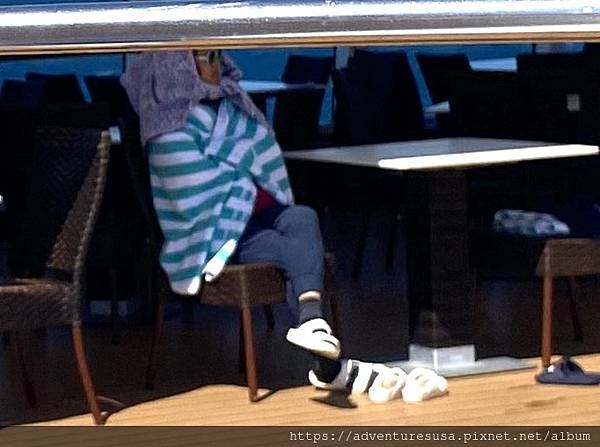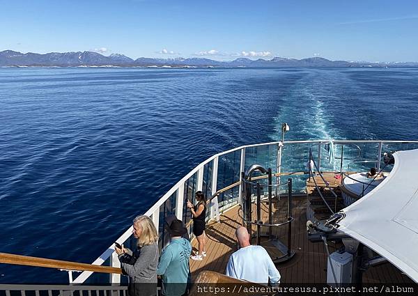 Day 4: 海上日。雖然是夏天, 外頭氣溫蠻低。甲板上散步的乘客都是長袖長褲加外套。