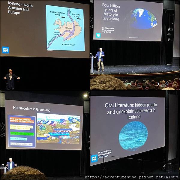 Day 9: 海上日。船方安排了好幾場非常知性的演講, 介紹冰島與格陵蘭的地理、歷史、人文。講者是一位退休的人類學教授。可是他已經退休超過十年, 垂垂老矣, 演講很不精彩, 缺乏流暢性與娛樂性。但是海上日大家都很無聊, 所以幾乎座無虛席。