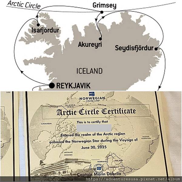 我們上床後, 郵輪一路往北, 短暫進入北極圈。所有乘客都拿到一張證書, 證明我們進去過北極圈。