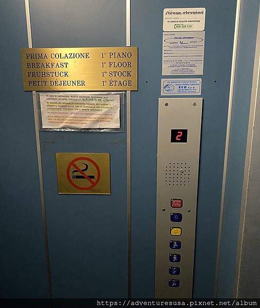 電梯裡用四種語言寫著早餐在一樓。其實是我們所謂的二樓, 歐洲很多地方的地面樓叫做零樓。